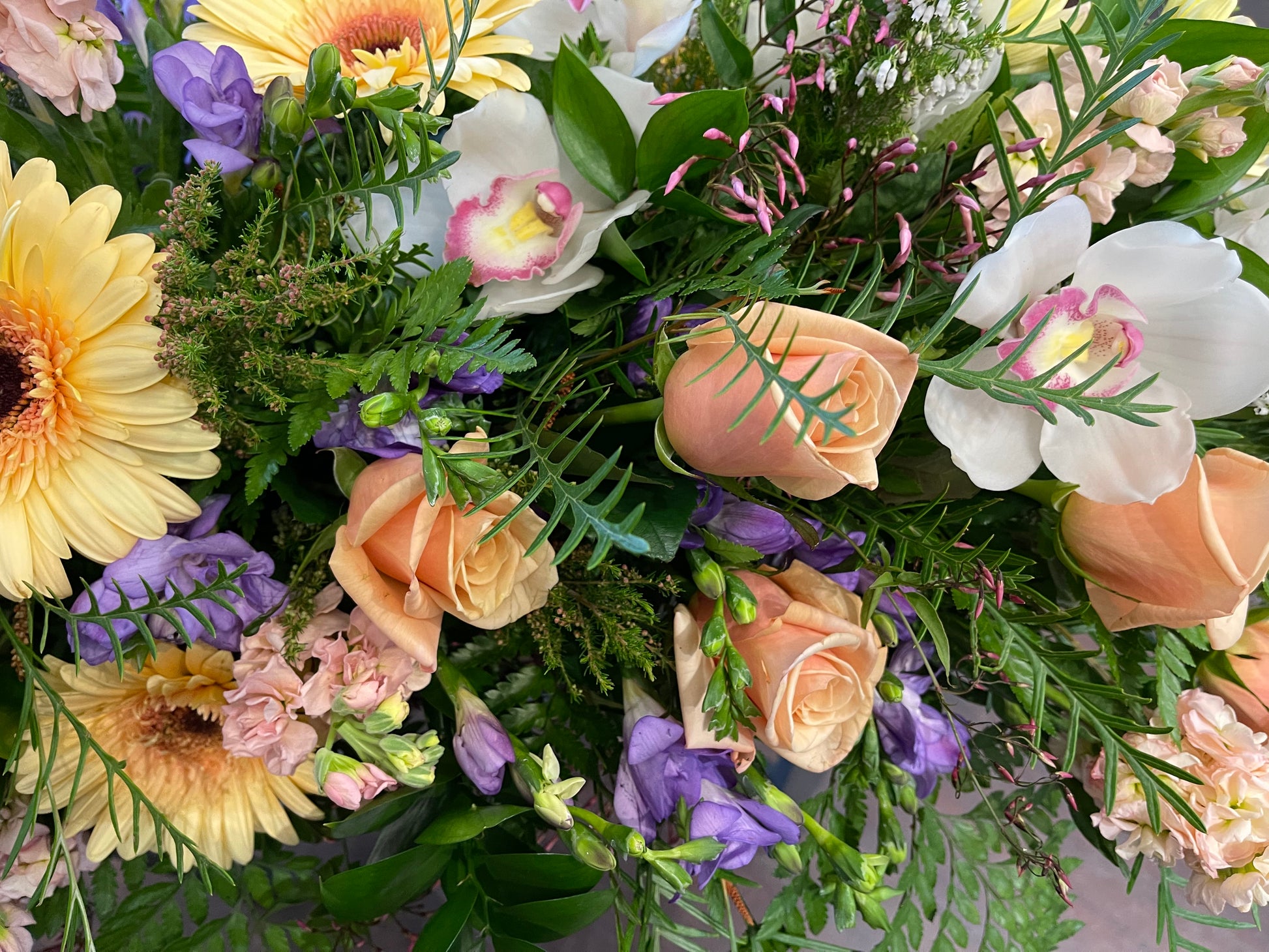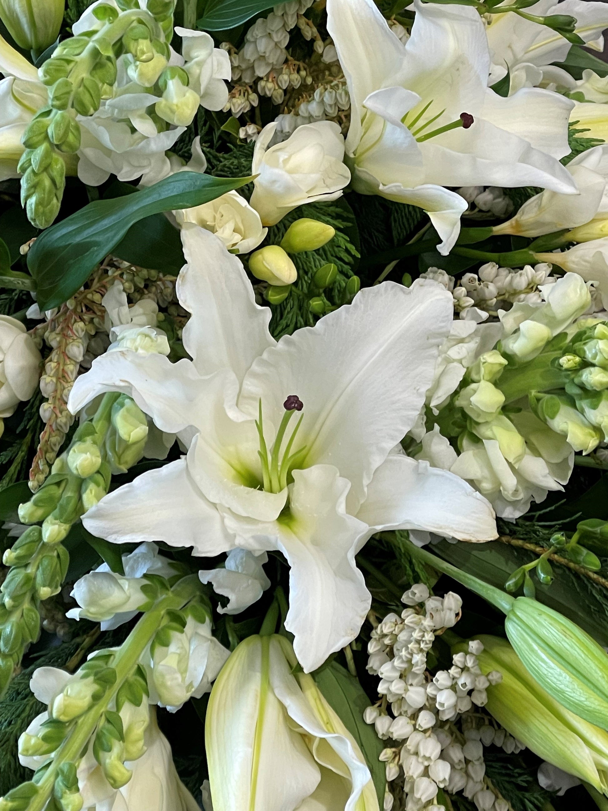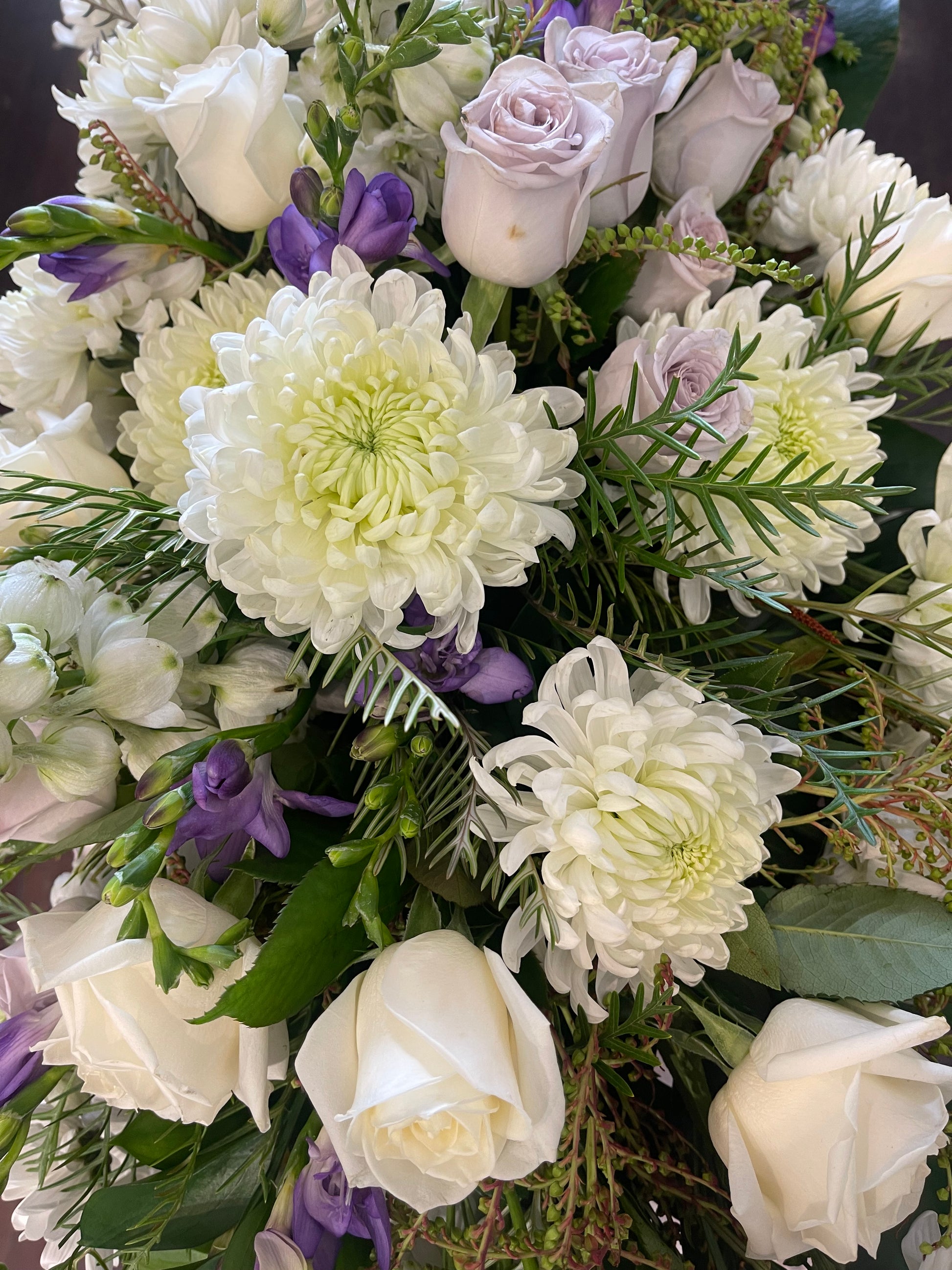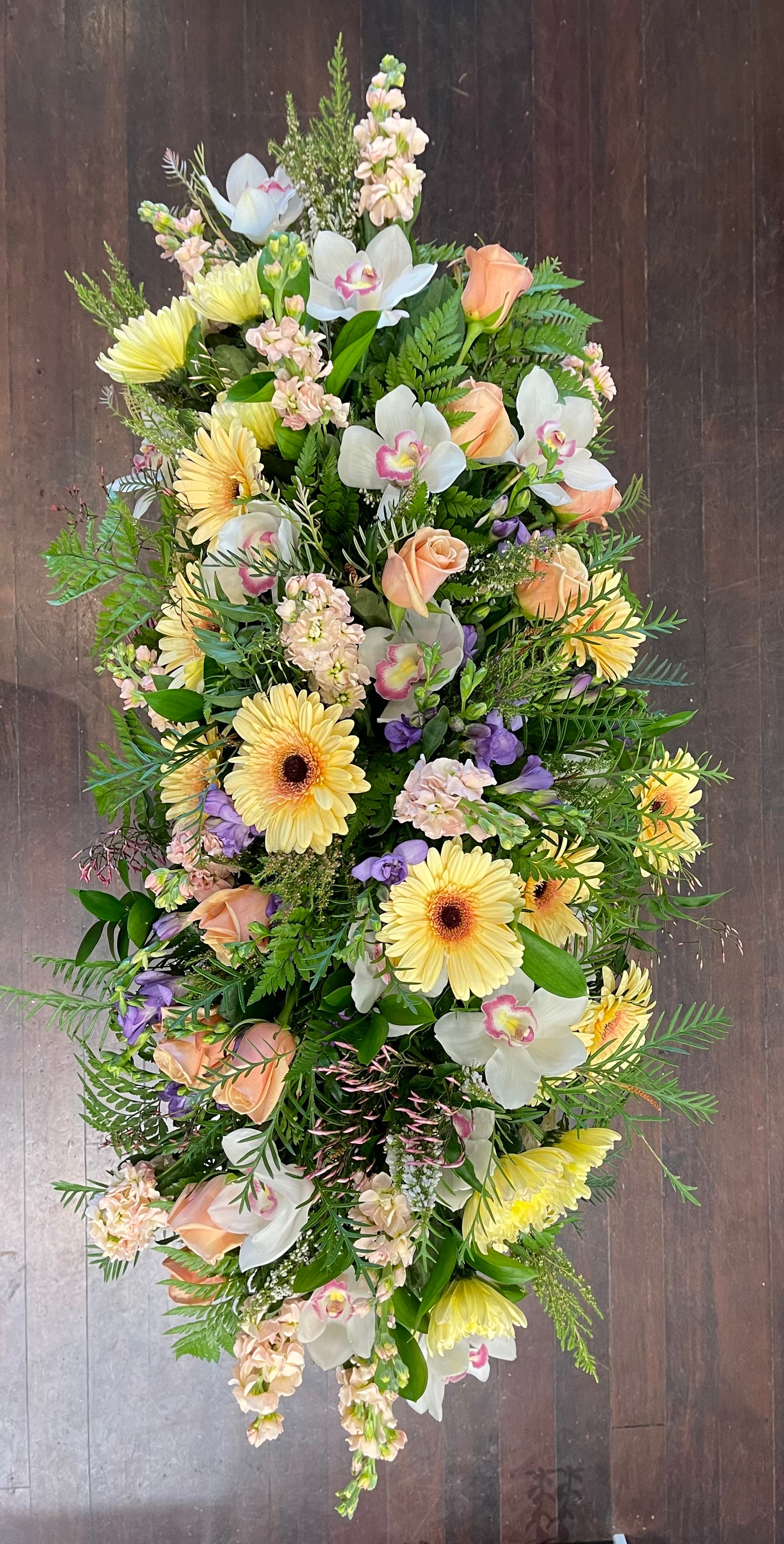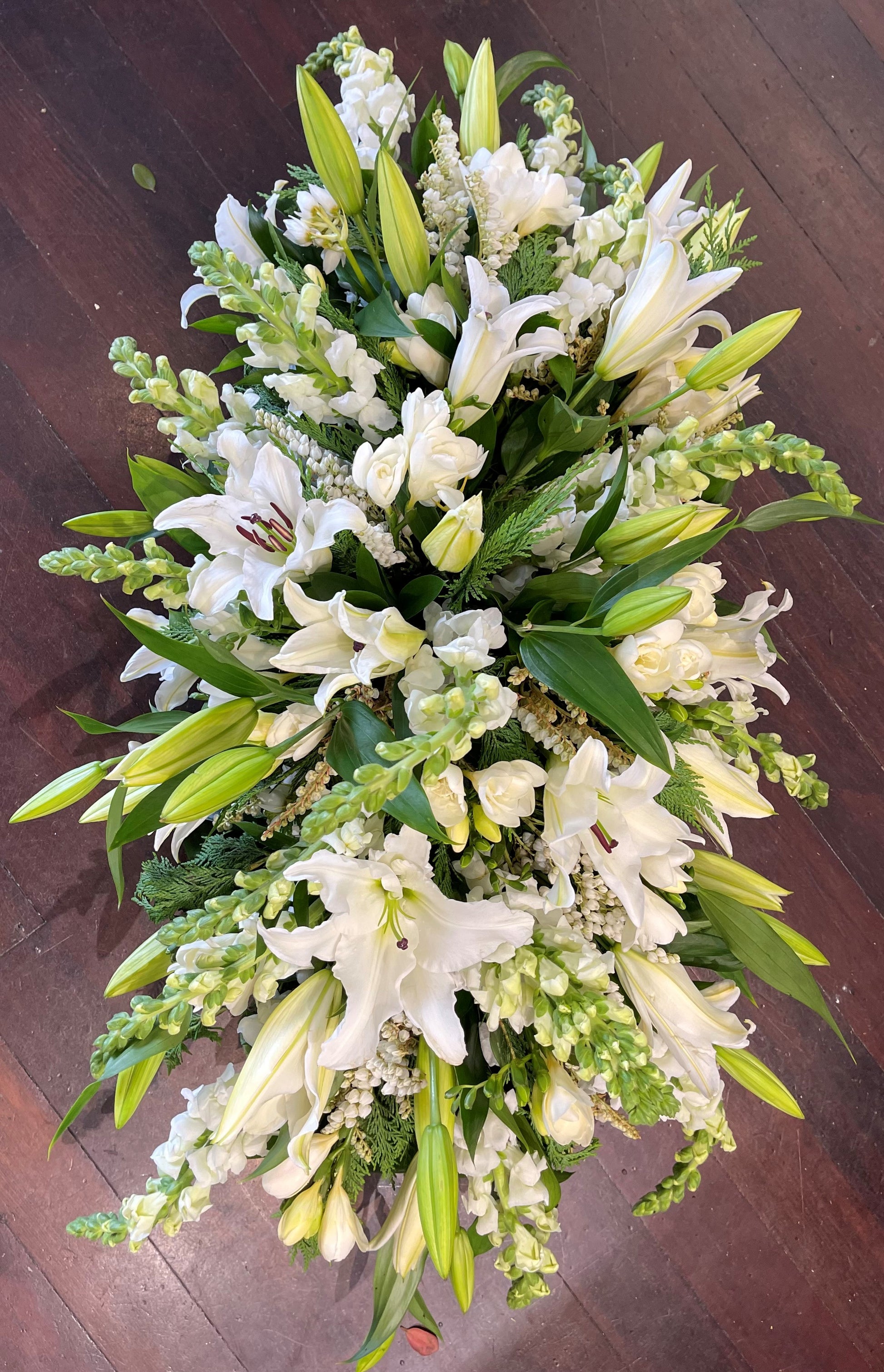 Due to the size and delicate personal nature of this arrangement we do require customers contact us 2 days before the farewell / funeral to place an order. We take pride in our farewell arrangements and want to ensure that your loved ones send of is as perfect and seamless as possible. We are able to do any colour combination you would like. Flowers may vary from season to season.